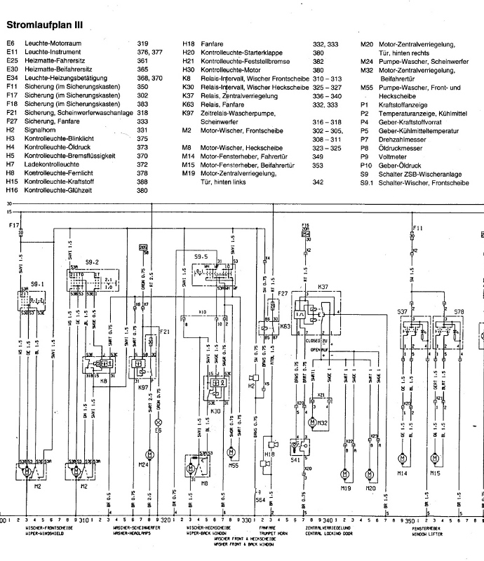 Die Wischermotoren siehst Du unten rechts in der Ecke, 1x mit und 1x ohne Intervall (bei M2 Kennzeichnung), S9.1 Schalter-Wischer Frontscheibe.. S9.2 Schalter-Wischer Frontscheibe Intervall.. liegen rechts oben, K8 ist das entsprechende Relais, das findest Du unterhalb vom S.9.2.