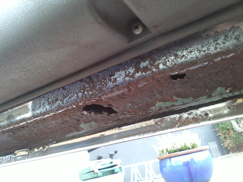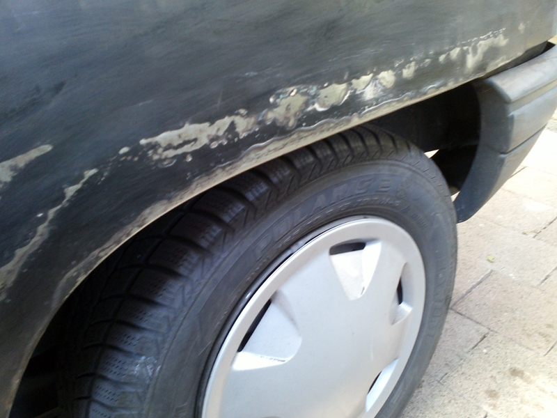 Gestern habe ich die Fahrertür notdürftig gespachtelt (Loch siehe Bild), da die üblichen Stellen durch den Ablauf verrostet bzw. durchgerostet waren. Sollte also erstmal für den Winter halten! Anscheinend hatten die Vorbesitzer ein paar mal die Heckschürze als Rammbock missbraucht, auf der Fahrerseite war diese komplett schief... also auch hier wieder Hand angelegt.