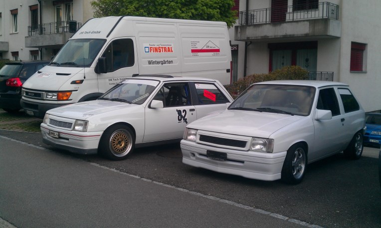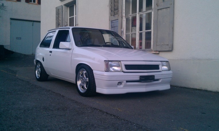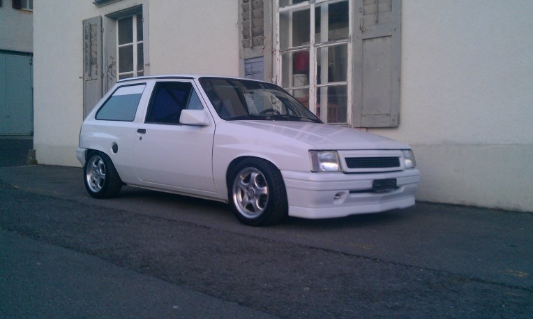 @ZebRockSki ja wo soll ich den anfangen? :P also der weisse 1.6l hat einen sehr grossen presönlichen wert.der Corsa gehörte mal meinem ehemaligem Vorarbeiter,der hatte die ersten umbauten gemacht.als er mich in der Ausbildung mal über einen Pass mitnahm war ich hell begeistert vom Corsa.naja viele jahre später konnte ich ihn dann abkaufen und ich hielt den Corsa immer bei laune,kannst mal den Dani fragen,er hat mier kürzlich die Radläufe hi und vorne gemacht und er weiss wie viel spass das ding macht.ich fahre den corsa nur durch den Sommer,hege und pflege ihn.also mal ein paar technische Daten: gemachter C16SEI,KW Gewinde v2,komplett PU buchsen,Chassis verstärk, Wichers Überrollkäfig aus Stahl weiss pulferbeschichtet,Domstrebe,Stahlflegleitungen,Kadett GSI 16V bremsen vorne,innen ausgeräumt,2Sparco Vollschalensitze und ein altes Panasonic Radio für zwischen durch.Carossierie ohne schiebedach,ohne heckspoiler,Radläufe hinten frisch eingeschweisst durch Daniel :top: , hi + vo gezogen mit einer neulackierung im Original Casablanca weiss.Felgen 14Zoll mit Yokohama A539.