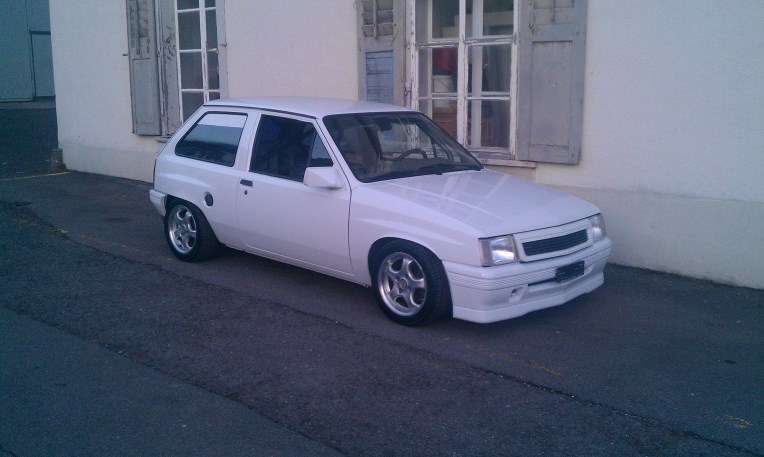 @ZebRockSki ja wo soll ich den anfangen? :P also der weisse 1.6l hat einen sehr grossen presönlichen wert.der Corsa gehörte mal meinem ehemaligem Vorarbeiter,der hatte die ersten umbauten gemacht.als er mich in der Ausbildung mal über einen Pass mitnahm war ich hell begeistert vom Corsa.naja viele jahre später konnte ich ihn dann abkaufen und ich hielt den Corsa immer bei laune,kannst mal den Dani fragen,er hat mier kürzlich die Radläufe hi und vorne gemacht und er weiss wie viel spass das ding macht.ich fahre den corsa nur durch den Sommer,hege und pflege ihn.also mal ein paar technische Daten: gemachter C16SEI,KW Gewinde v2,komplett PU buchsen,Chassis verstärk, Wichers Überrollkäfig aus Stahl weiss pulferbeschichtet,Domstrebe,Stahlflegleitungen,Kadett GSI 16V bremsen vorne,innen ausgeräumt,2Sparco Vollschalensitze und ein altes Panasonic Radio für zwischen durch.Carossierie ohne schiebedach,ohne heckspoiler,Radläufe hinten frisch eingeschweisst durch Daniel :top: , hi + vo gezogen mit einer neulackierung im Original Casablanca weiss.Felgen 14Zoll mit Yokohama A539.