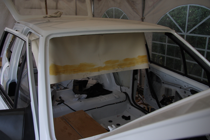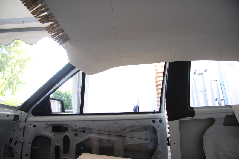 Wie dem auch sei, der neue Himmel ist ja jetzt da und wartet nur noch darauf eingebaut zu werden. Erstmal hängt er nur lose drin und mit den Wäscheklammern nur mal in Position gebracht um zu schauen ob auch alles passt. Naja die C-Säulen-Stücke sehen momentan noch etwas kurz aus. Muss ich aber nochmal schuen, vielleicht lässt sich das noch etwas ziehen. An sonsten werden die auch durch was schwarzes ersetzt.