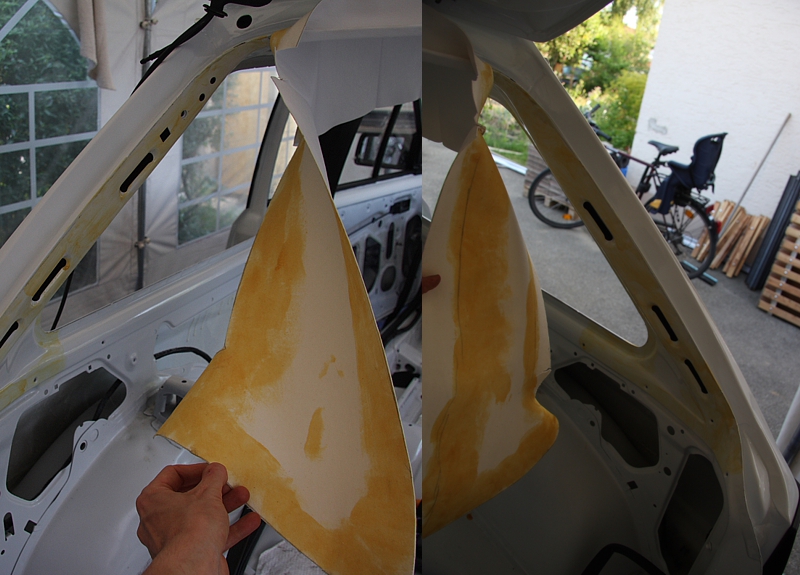 Erstmal natürlich a- und B-Säule mit schwarzem Kunstleder beklebt. ging auch ganz gut, muss ich sagen. Bin leider ein bisshcen verrutscht beim kleben, so dass ein kleines unbeklebtes Eck nacher evtl unter der Fensterdichtung hervorschaut. Wird sich zeigen.