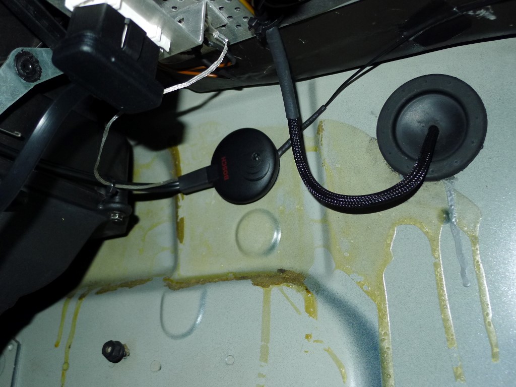 Bosch Scheibenklebeantenne, etwas unkonventionell montiert. Anstatt alles incl. der Antennendrähte auf die Scheibe zu kleben, habe ich den Verstärkerteil unten an die Stirnwand montiert.