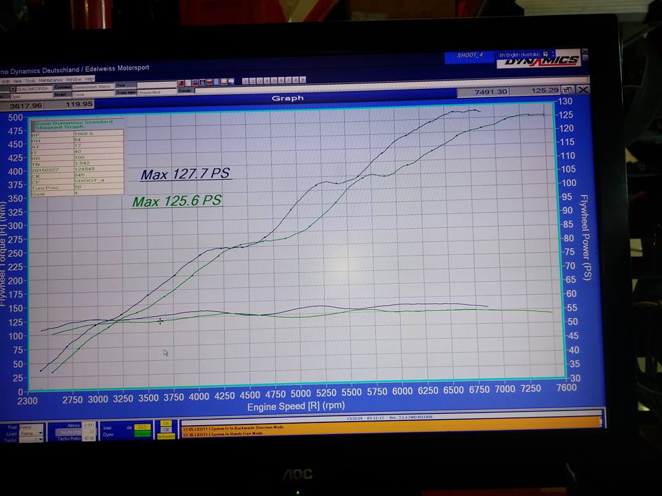 hier mal das letztgemessene Leistungsdiagramm... Schön zu sehen der Vergleich zwischen alter und neuer Abstimmung. Leistung liegt aktuell immer ca. 500-1000U/min früher an als vorher... (Blaues Diagramm neu, grün alt) Und das Drehmoment ist übers gesamte Drehzahlband auch etwas angestiegen.