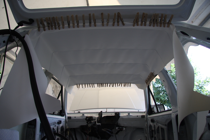 Heut hab ich dann noch den Himmel fertig gemacht. Ich bin zufrieden damit. Was ich lernen musste ist, dass man wirklich nur die Kante wo später auch die Dichtungen drüber kommt, bekleben soll. Ich hab den Kleber vorne zuweit hochgestrichen. Sieht man jetzt halt, aber die Griffe ect. kaschieren das noch etwas. Also der Himmel hält wirklich rings um an einem 1cm breiten Streifen. Find ich irgendwie faszinierend.