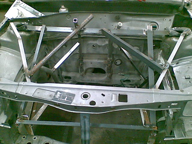 Mit Hilfe diesen Gestells wird erst die Front und das Domblech angesetzt. 2 Befestigungspunkte sind u.a. die Gewindelöcher in der Kühlertraverse, in denen die Zugstreben befestigt werden. Ganz zum Schluss setze ich dann den Dom wieder drauf. Da habe ich die 2 Punkte/Löcher oben und auf dem Domblech sind Markierungen in der der Dom hin muss