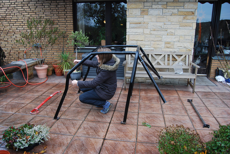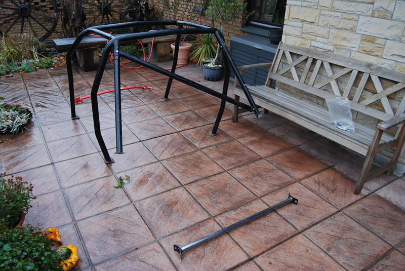 So hab mal den Käfig eingebaut um zu gucken wo ich bohren muss, da ich mit der Beule nicht weiterkam (u.A. Gas vom Schweißgerät leer). Boah ist das ne Kackarbeit alleine, nie wieder !!!