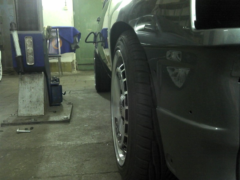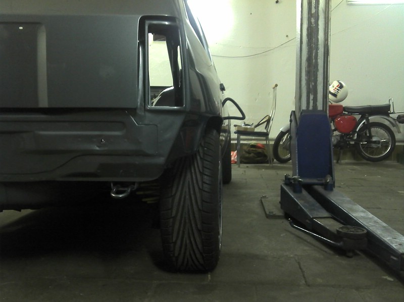 Auf der Hinterachse sind die 10er Platten montiert. Damit ist es halbwegs ausgeglichen zwischen Vorder- und Hinterachse. Der Kotflügel wurde bloß mal probehalber fürs Foto aufgelegt.