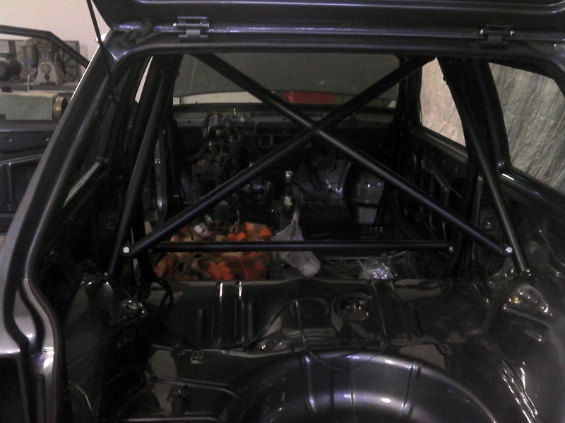 Freitag haben wir das Grundgerüst des Käfigs eingebaut. Den Unterboden mit Steinschlagschutz besprüht. Die Hinterachse und den Tank eingebaut.