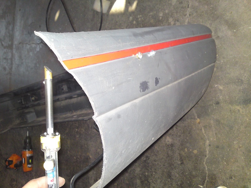 Nach Anpassung an den Breitbau fehlten natürlich die originalen Halter,außerdem hätte ich da schon wieder neue Löcher ins Auto bohren und alte zu schweißen müssen...also hab ich die Vorface-halter an die Facelift-Stoßstange gescheißt(Kunststoffschweißkolben und PlastikKleiderbügel)