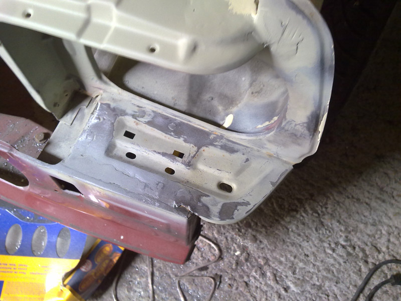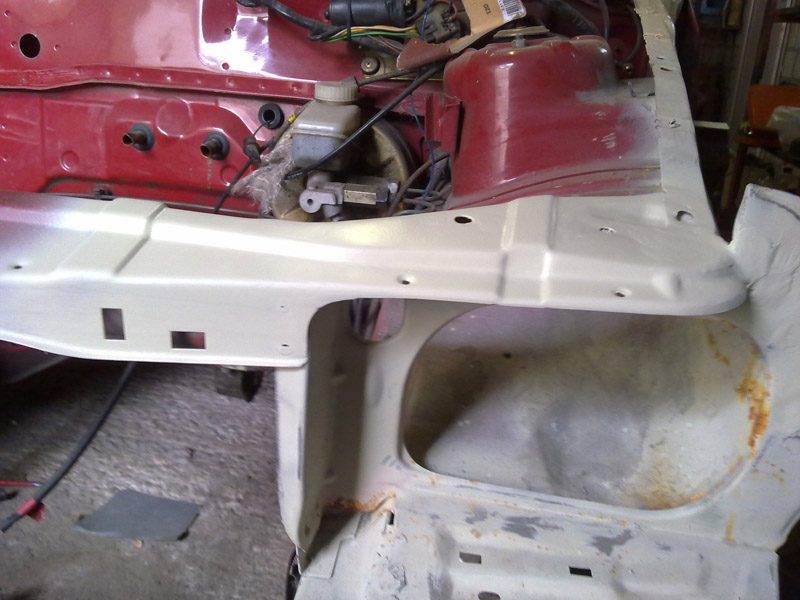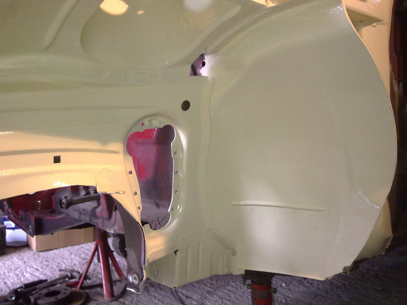 Das ganze konnte nun schön ziehen und wird heute mit der ersten Schicht Brantho überzogen. Gleichzeitig kümmere ich mich um den anderen Radlauf und den Motorraum, der in den letzten Tagen auch komplett zerlegt wurde.