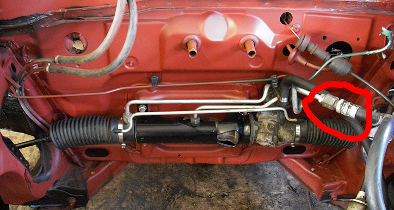 Die Druckleitung der Servo geht mit 22er Schlüsselweite ins Lenkgetriebe rein (da wo die Aluleitung soweit rausguckt)