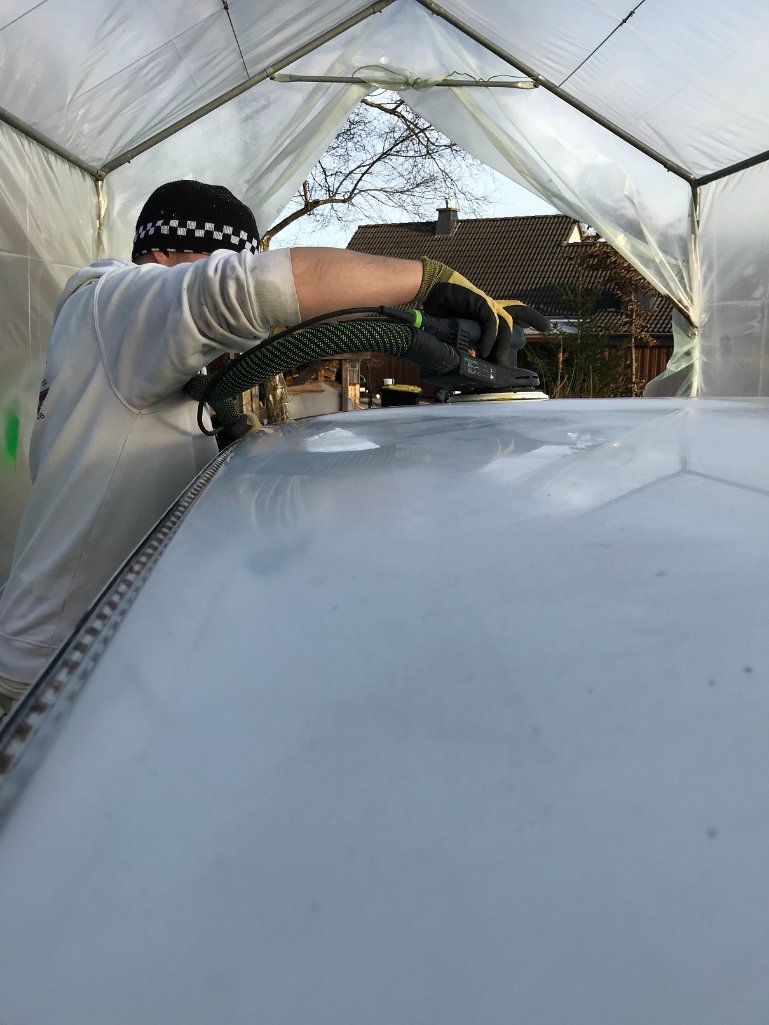 Nachdem Simon den Corsa durchgeschweißt hatte habe ich das Projekt wieder in meinen Folientunnel geholt. Hier wurden dann einige Wochen lang geschliffen und gefüllert. Dazu kamen dann noch Arbeiten wie z.B. Motorausbau und Anpassen vom VFL Heckspoiler und Heckstoßstange. Dann zum Geburtstag eine Überraschung von meiner Frau: GSI Scheibenrahmen und originale grüne Teppiche aus den 80ern.