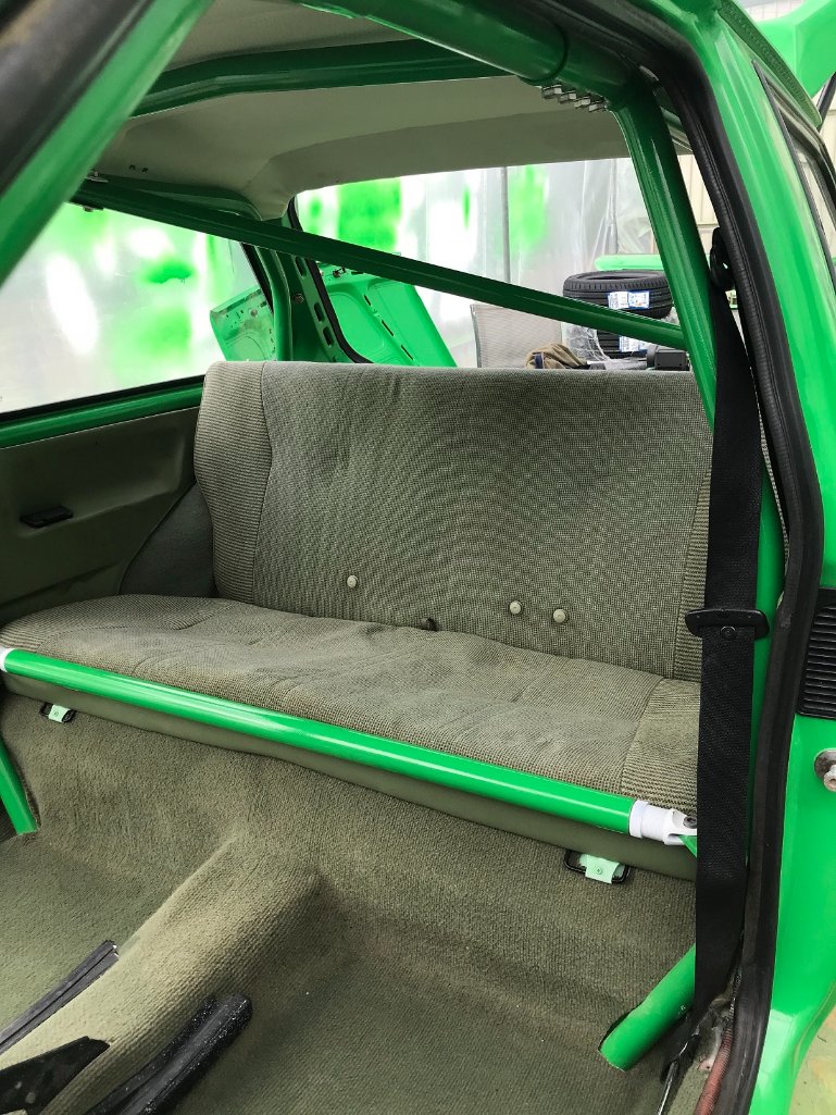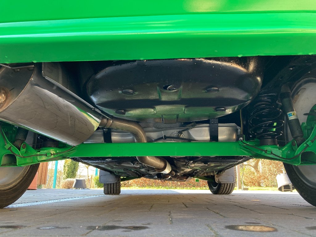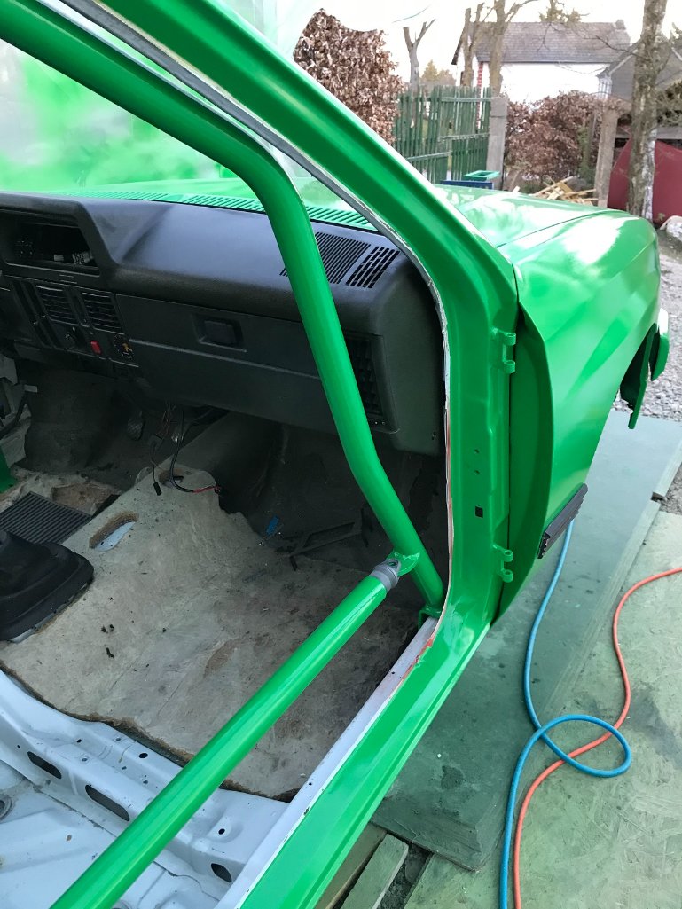 Sodann ging es schlag auf Schlag, man will fahren! Also die Bastuck Gruppe A eingebaut. Natürlich sahen die DTM Endrohre scheiße aus. Also 60mm Edelstahlrohr besorgt, angepasst und beim Metallbauer anschweißen lassen. Nach kurzer Zeit festgestellt, das die 30mm H&R Federn zu tief sind. Also ab in den Keller und die Diesel/GSI Originalfedern frisch gemacht. Dazu an der Hinterachse noch 20mm Hi-Jackers eingebaut. So sah das Amtlich aus. Jetzt ging es an die grüne Innenausstattung. Einmal alles gründlich reinigen und einbauen. Hat schon etwas geschmerzt, diese gut erhaltenen grünen Teppiche für den Käfig anzupassen... Dann endlich meine Traumfelgen erstanden. Ronal Irmscher in 6x15 ET28 in Verbindung mit 195/50-15. Gutachten gab es für 35Euro bei Irmscher. Natürlich habe ich immer wieder auch vermeintliche Kleinigkeiten neu gekauft. Wie z.B. immer wieder originale Aufkleber sowie auch das Gutachten von dem Heigo Käfig mit neuer Plakette. So wurde der Wagen langsam fertig. Ganz liebe Grüße gehen raus an alle die hier freundlich schreiben!