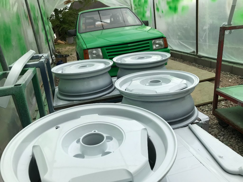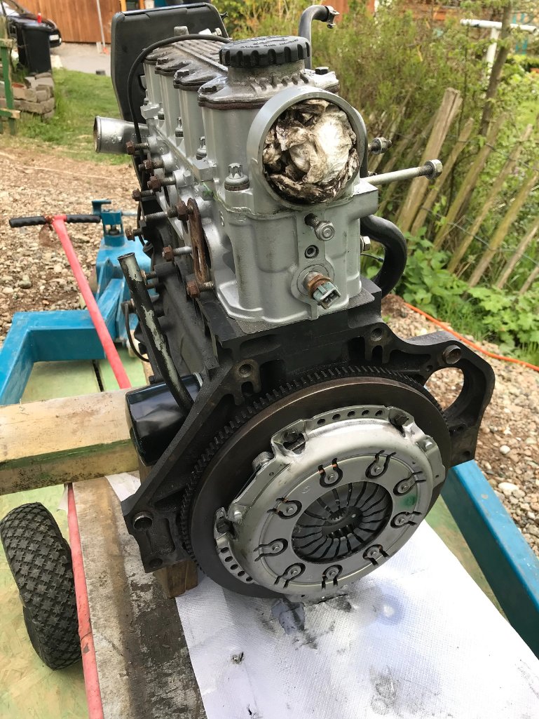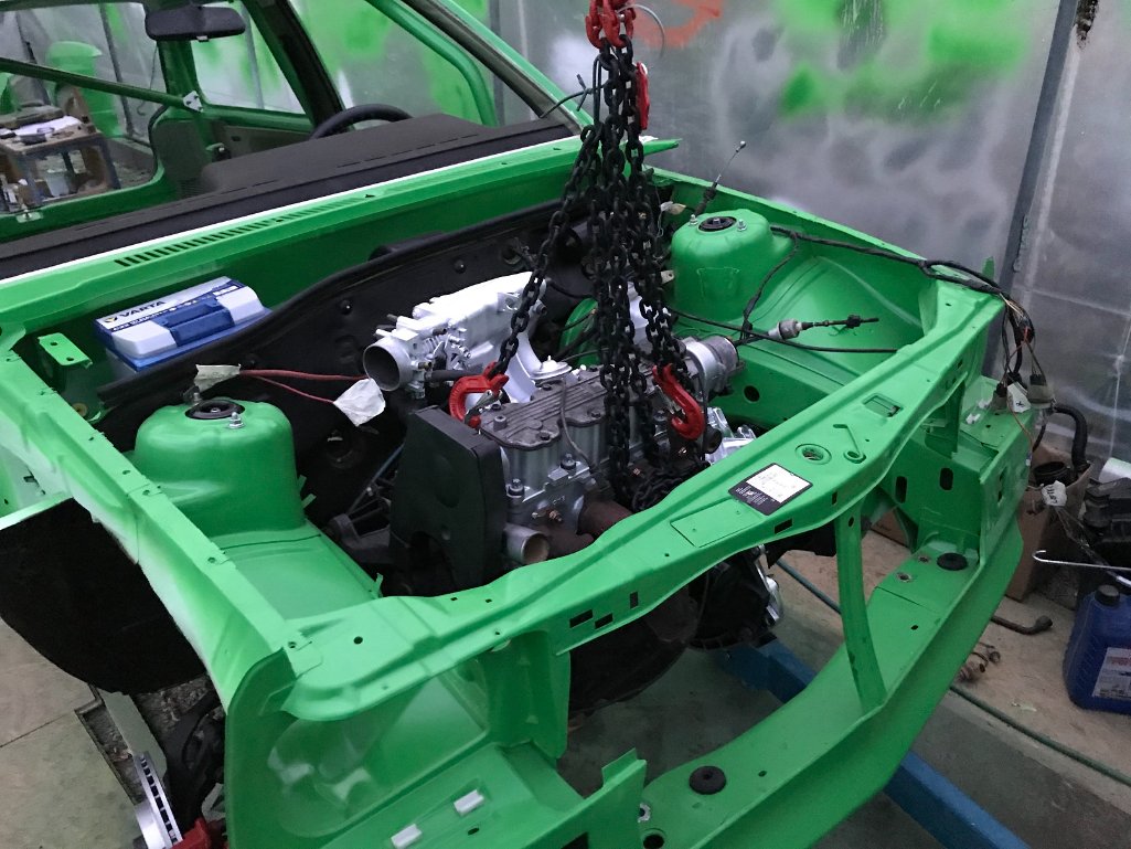 Nach dem Lackieren gings ans Zusammenbauen. Als erstes habe ich das grüne Armaturenbrett eingebaut, sowie die grünen A und B Säulen Verkleidungen eingeklebt. Dann kam der Heigo Käfig an die Reihe. Der ging relativ einfach rein, da er sehr passgenau ist. Zwischendurch die Innenradläufe mit neuem U-Schutz versehen und die Vorderachse mitsamt neuer 256x20mm (Tigra)Bremse eingebaut. Schon während der Schweiß und Lackierarbeiten war klar es kommt ein C16NZ rein. Aber es kommt immer anders als man denkt. Simon hatte den C16SEI noch liegen und hat ihn für mich neu gelagert, ZKD, Wapu, Ventile eingeschliffen usw. Also einmal komplett frisch gemacht. (Riesen Dank an Dich!) Während dessen habe ich das F13 gereinigt und neu lackiert. Eine neue Kupplung kam auch rein sowie neuer KW-Sensor und andere Kleinigkeiten. Der Einbau ging mit Hilfe von Simon spielend leicht. Bei dem C16SEI Umbau ist mir dann aber erstmal klar geworden das es Teile für diesen Motor nicht mehr an jeder Ecke gibt.